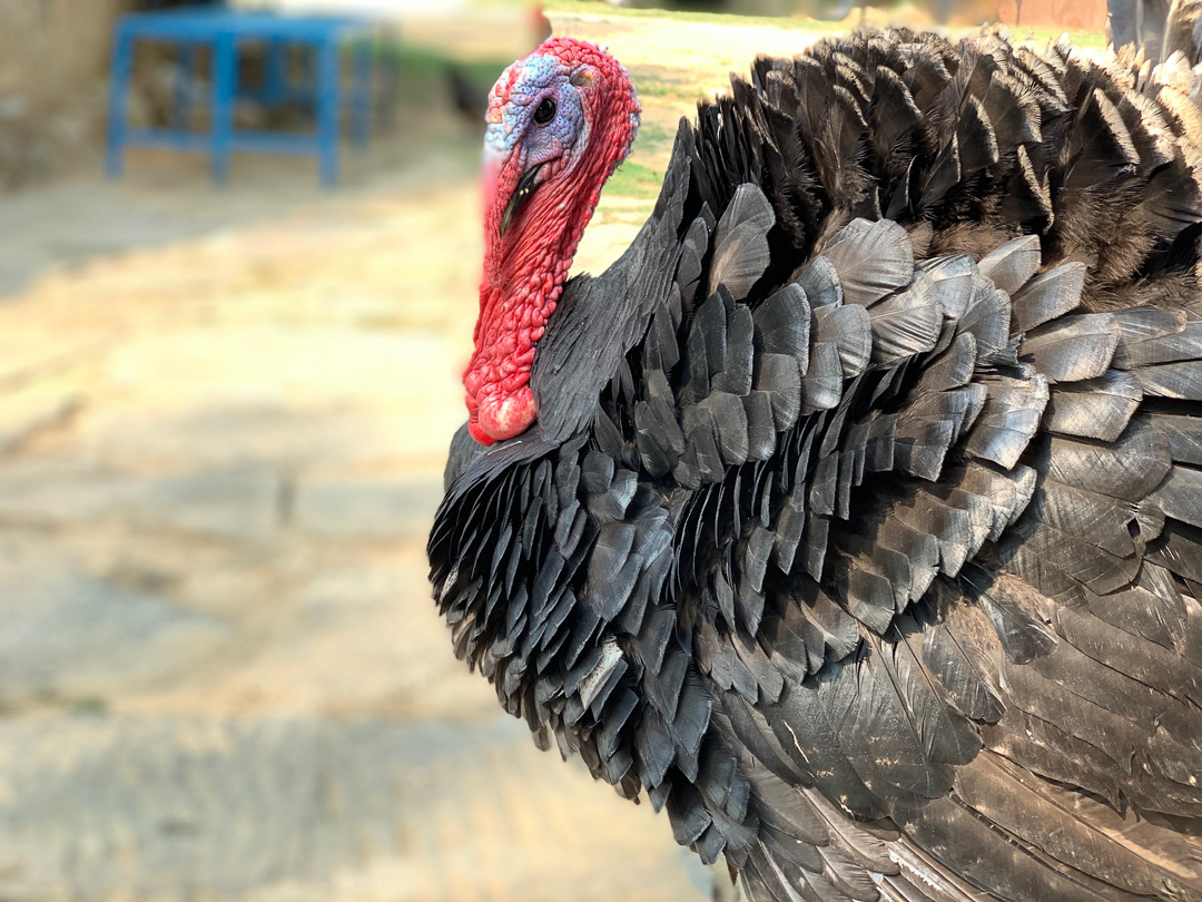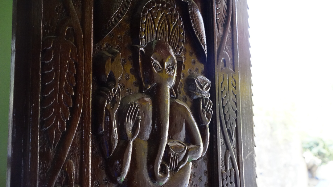At our Hotel Brindaban, Ganesha on the door and turkeys in the courtyard.