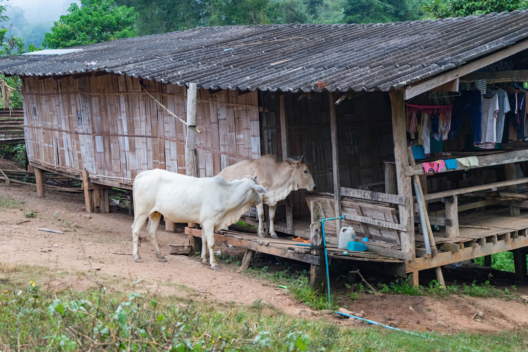 The Lahu people were warm and welcoming. Their tiny village, a throwback to another time. In many ways a simpler, better time. A juxtaposition of old world jungle living, in bamboo and wood huts, with no electricity. Running water provided the way the Romans did, by diverting a stream higher on up the hill through pipes, to each home. However, most adults had a cell phone and walked up to the top of the hill to receive a cell phone signal to stay in touch with the outside world. Cows, pigs, chickens and dogs all roamed freely about, with water buffalos leery of humans, and us of them, no more than a stone’s throw away.