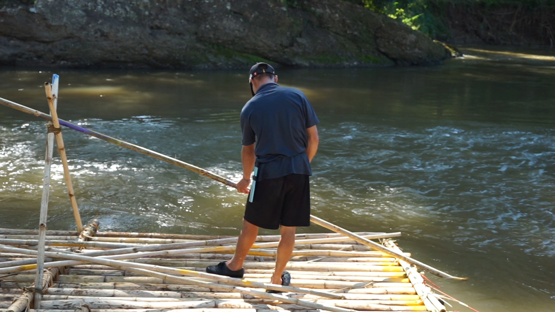 At one point when we stopped for lunch prior to rafting to the village, we were preparing to eat a tasty Pad Thai, wrapped in a banana leaf, another wonderful prevalent plant. It quickly became apparent that someone had forgotten to bring the standard eating utensil in Thailand, the spoons. Tony our guide, and soon to become our friend, instructed his younger brother brusquely to do something. Mooky, a wonderful Thai woman, working for Give, explained that Tony had told his brother to make us chopsticks with bamboo. We watched as he carefully split bamboo, and removed splinters from the material.