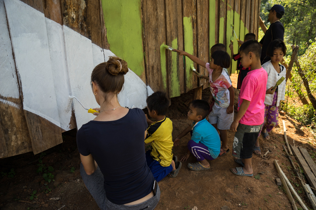 A year later, another tragic accident, the second in 8 years. A new focus on trying to help people, to carry on the legacy of Jonathan. In November 2018, we went to Pong Ngan, Thailand, another Give location. It is out in the middle of nowhere, in the jungle outside of Chiang Mai, Thailand. Prior to leaving, with lots of support from friends and family, we raised the money to build a small community center there, in honor of Jon. It was constructed through Give, by the Lahu Tribe. Jon’s good friend, Rey Jaffet, was going to paint a mural on the community center.