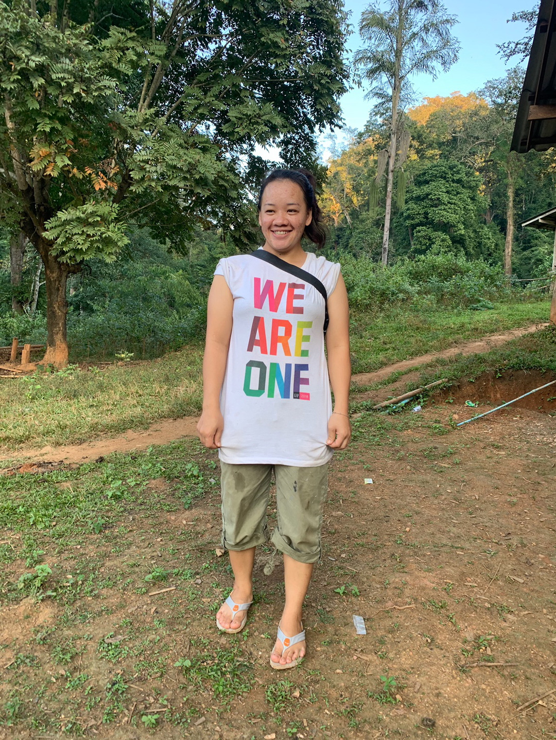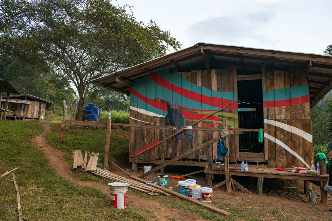 We arrived after a 26-hour flight, a two-and-a-half-hour drive outside of the city, a one-and-a-half-hour drive on bumpy rutted 4 x 4 jeep trails, culminating in a one-and-a-half-hour bamboo raft trip down stream. The bamboo raft was made by hand, as we waited, by one of the Lahu people. Twenty minutes after we arrive, standing in front of the little community center up walks this young woman. She speaks no English, had no idea what had been painted by Rey in the past, and knew virtually nothing about us. Guess what her shirt said? “We Are One”. What’s noteworthy about that? We Are One was also the main center piece of the huge mural, A Declaration of Hope, that Rey had recently painted in Miami. There is no possible way that this young woman new about that mural.