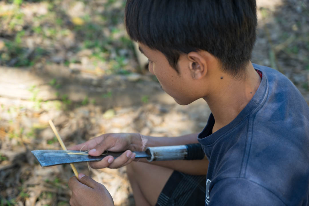 At 5 or 6 years old, a Lahu boy would receive his first machete, a tool they learn to use expertly, and they carry with them on their hip, daily. The way they weld the machete is more like an extension of their hand than a separate tool. Used to cut lumber, split bamboo, or slaughter an animal, it is a multi-purpose tool. Unlike some machete’s, these are fiercely sharp, but also carry a substantial weight. The bamboo that grows around the village is almost as important as air. It is used to make the afore mentioned rafts for traveling the river. They spilt it finely into half inch strips, somehow making a round bamboo trunk into a flat piece of building material used to make the siding on their homes. It also cleverly stays somewhat together in areas, the fibrous plant material clinging to each other, to make a more substantial siding.
